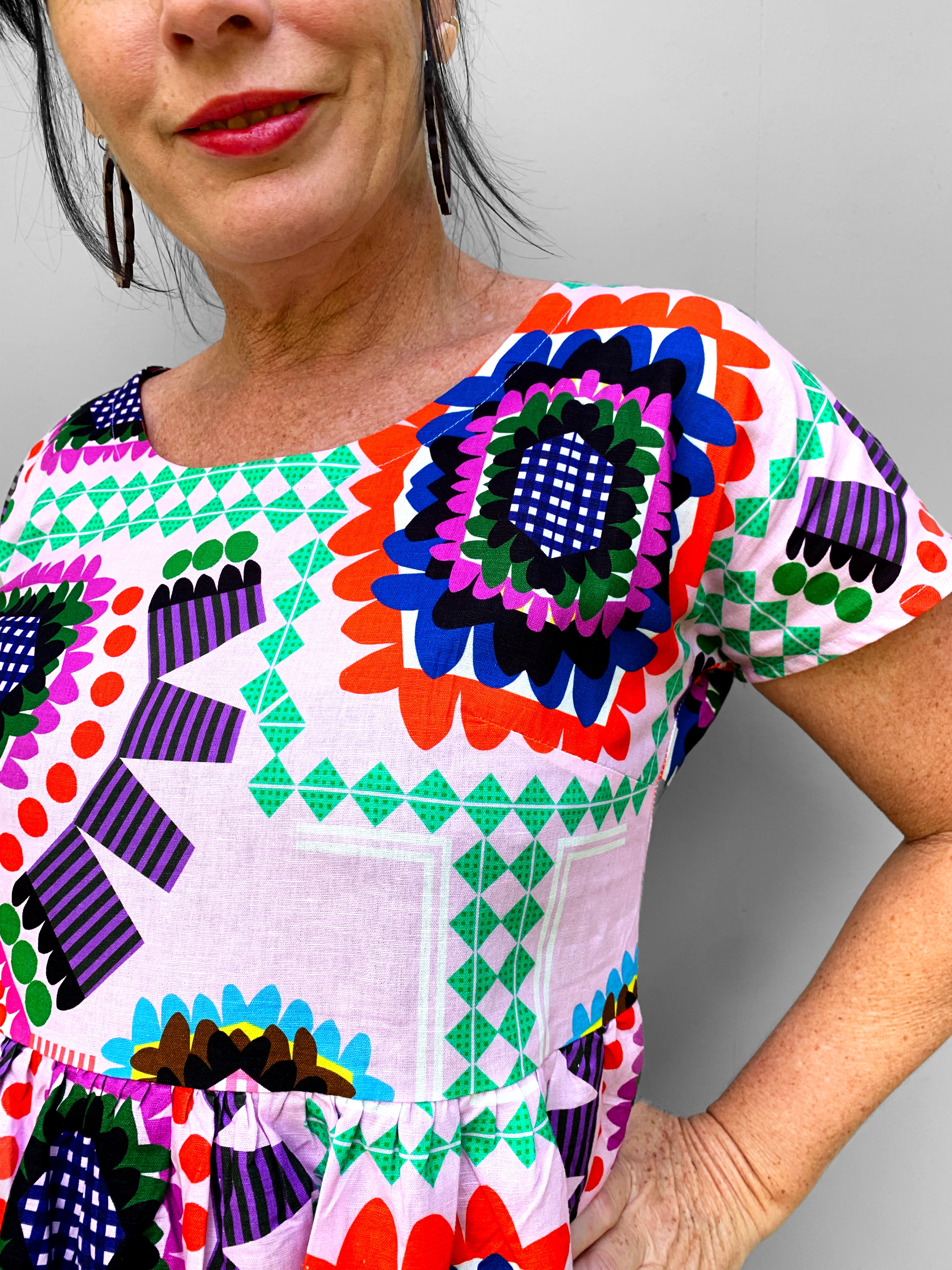 We can print the design in two sizes. Small for quilters and small projects or a larger scale for fashion and homewares. All our original designs are printed in the large scale. We have added the small scale as a new addition for quilters. All images when they are on our products have been printed in the large scale.